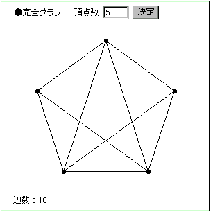 そこで, 思い切って, すでに作成されているプログラムを利用することにしましょう. そのプログラムは, 図2のように, 好きな数字を入力すると, その数を頂点数とする完全グラフを描いてくれるものとします. やはり, 頂点はきれいに正多角形状に並んでもらいましょう.