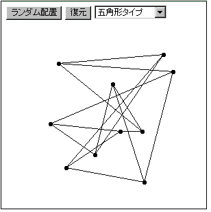 問題にある「ペテルセン・グラフ」は, 図3の左に示したきれいな形のグラフのことです. 実は, 右のグラフも頂点と辺の関係を考えると, ペテルセン・グラフと対等なものになっています. (グラフ理論では「2つのグラフは同型である」と言います.)つまり, でたらめに配置された頂点の位置を修正していくと, 右のグラフをきれいなペテルセン・グラフの形に変形できるのです. その変形を実行せよというのが, この問題の意味です. もちろん, マウスを使って頂点の位置を移動し, その変形を実行できるようなコンピュータのプログラムが用意されているものとしましょう.