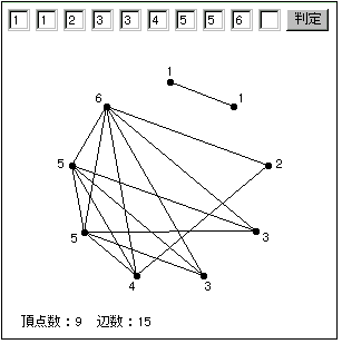 この問題も図4のようなコンピュータのプログラムがあることを前提とします. 画面の上に並んでいる小さな窓に数列を入力して, 判定 を押すと, その数列に対応するグラフがあれば, それを表示して, それがなければ, 画面には「グラフ的ではありません」と表示してくれるものとしましょう. その数列とグラフの対応は, 図を見ればわかるでしょう. それぞれの頂点から出ている辺の本数を並べたものが, その数列になっているのです. いろいろな数列に対して,そういうグラフが作れるかどうかを調べるのが,この問題の意図です.